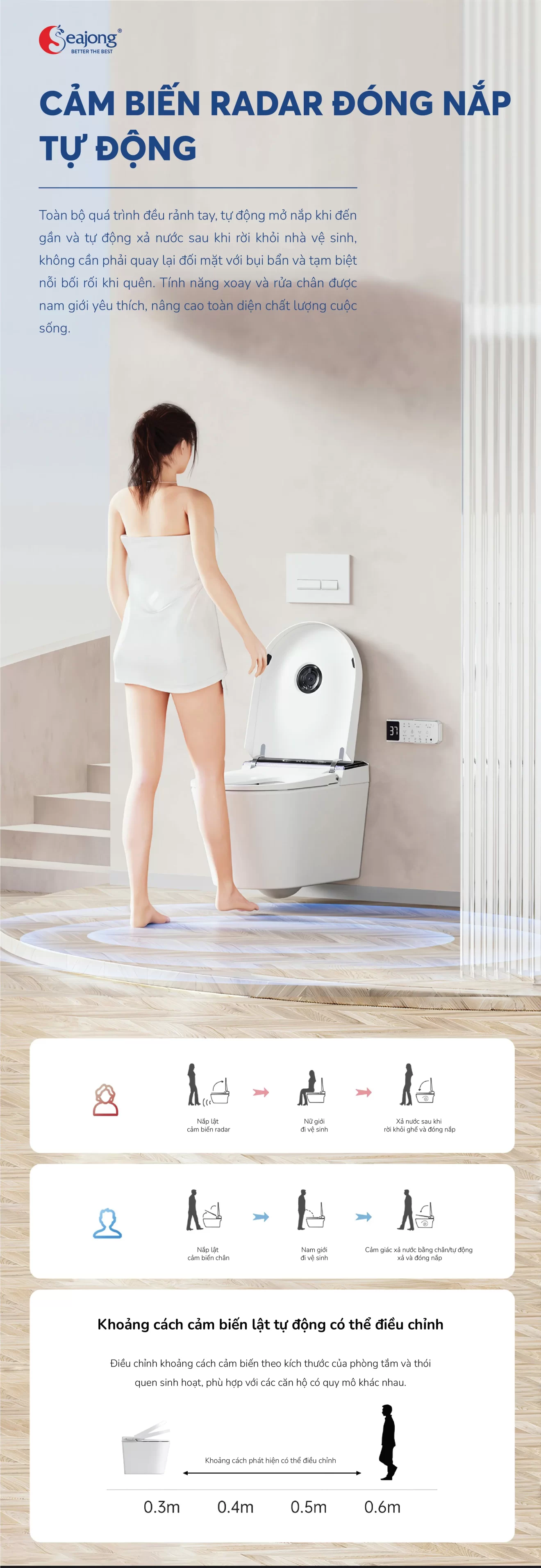 Điểm khác biệt của bồn cầu treo tường Seajong không nằm ở hình thức bên ngoài, mà ở triết lý phát triển sản phẩm: ưu tiên độ bền – an toàn – trải nghiệm lâu dài, đúng tinh thần công nghệ Hàn Quốc.